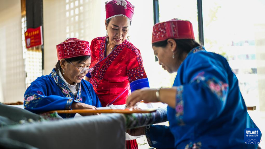 10月10日,苗族绣娘龙禄颖在位于贵州省施秉县的非遗工坊指导绣娘进行刺绣创作。