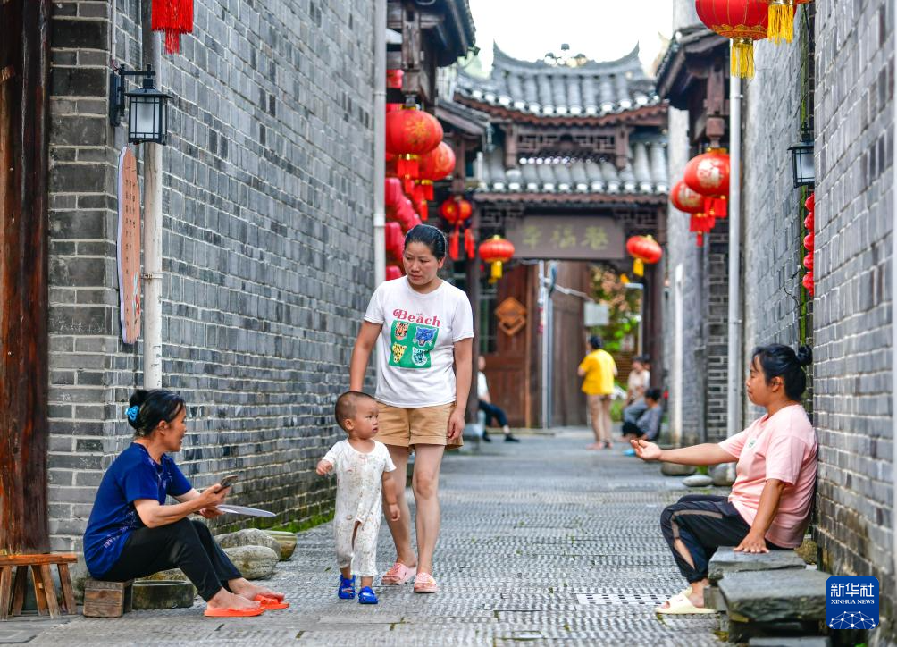 7月15日,贵州省天柱县坌处镇三门塘村的村民在干净整洁的古巷里纳凉。