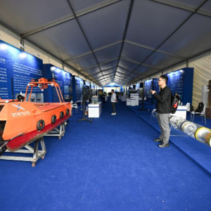 10月29日在深海先进技术及装备成果展上拍摄的智能巡航水面保洁无人船。