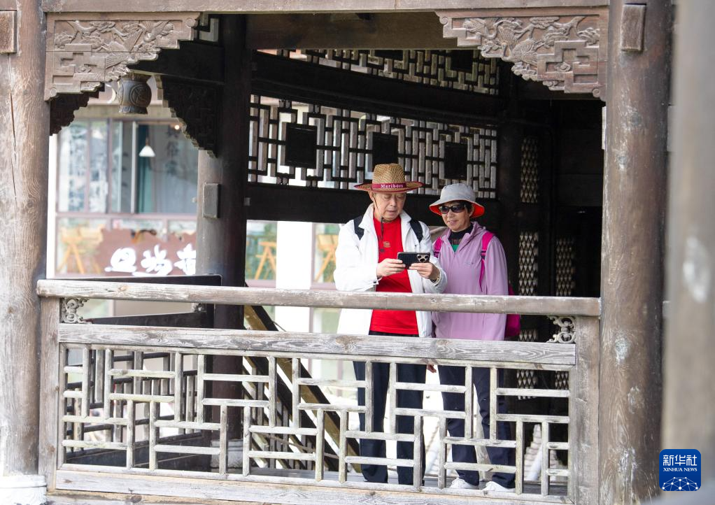 10月30日,游客在濯水古镇风雨廊桥景点拍照留影。