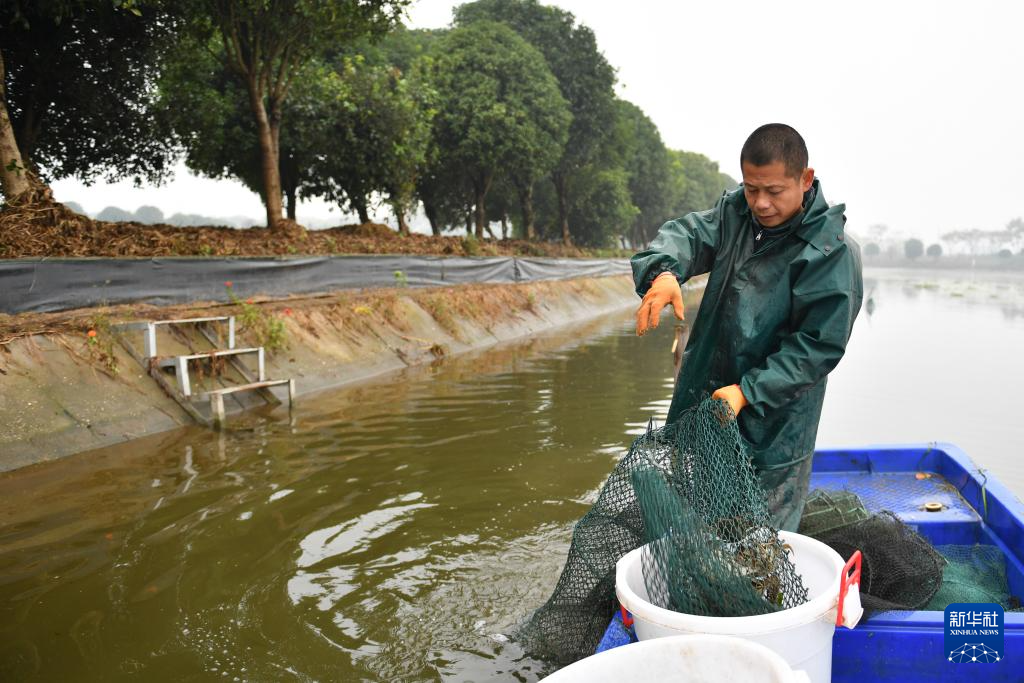 10月30日,在大通湖区河坝镇,蟹农将分拣后的大闸蟹投入暂养池。