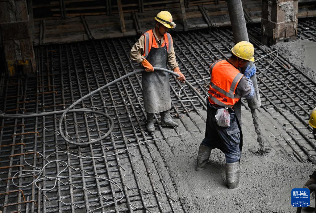 10月30日,工人在海门北站核心区基坑最后一块底板浇筑现场作业。