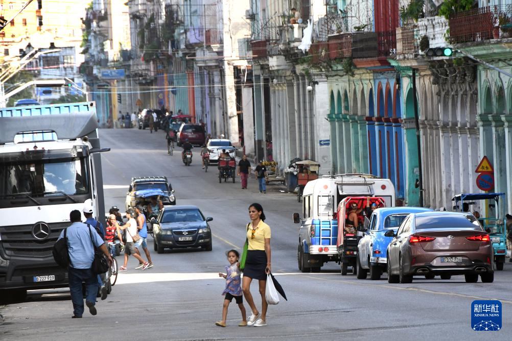 10月29日,一名妇女带着孩子穿过古巴首都哈瓦那街头。