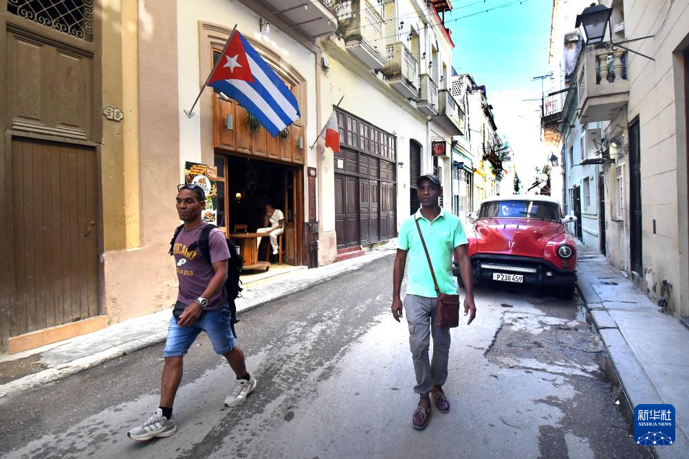 10月29日,两名男子走在古巴首都哈瓦那街头。