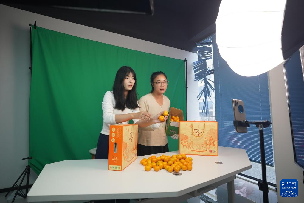 10月30日,在南丰县蜜桔产业科创园,工作人员在直播推销南丰蜜桔。