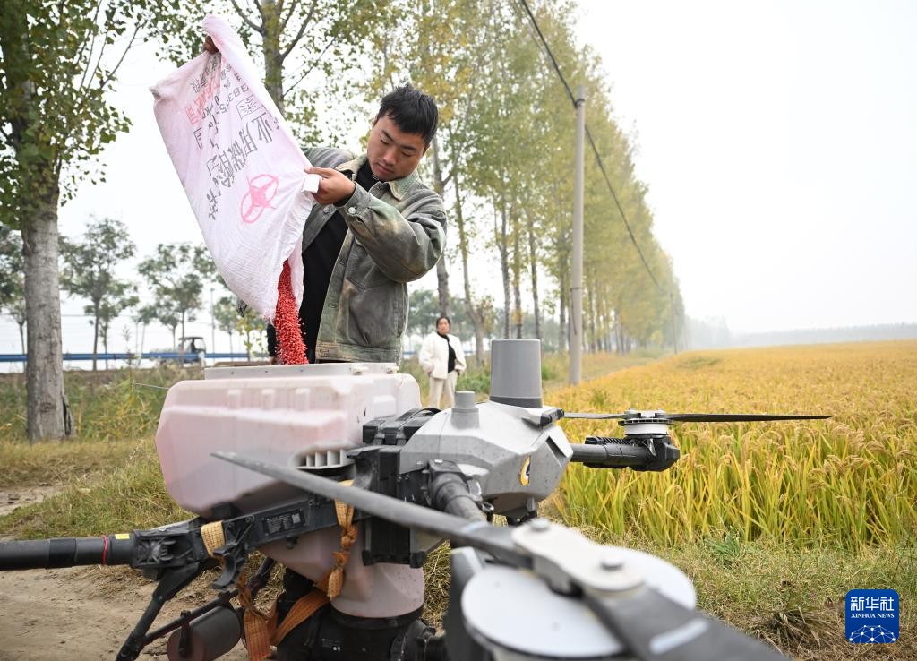 10月30日,在河南省原阳县太平镇太南村,农机手向无人机加载小麦种子。