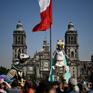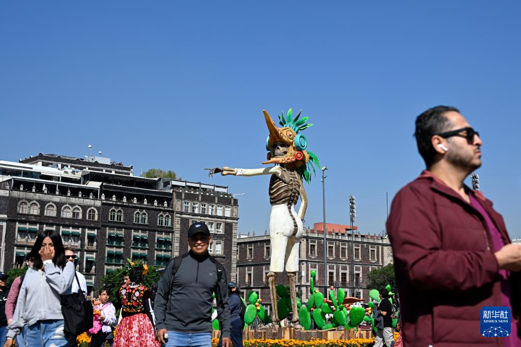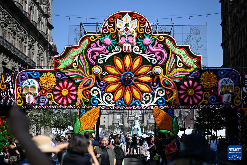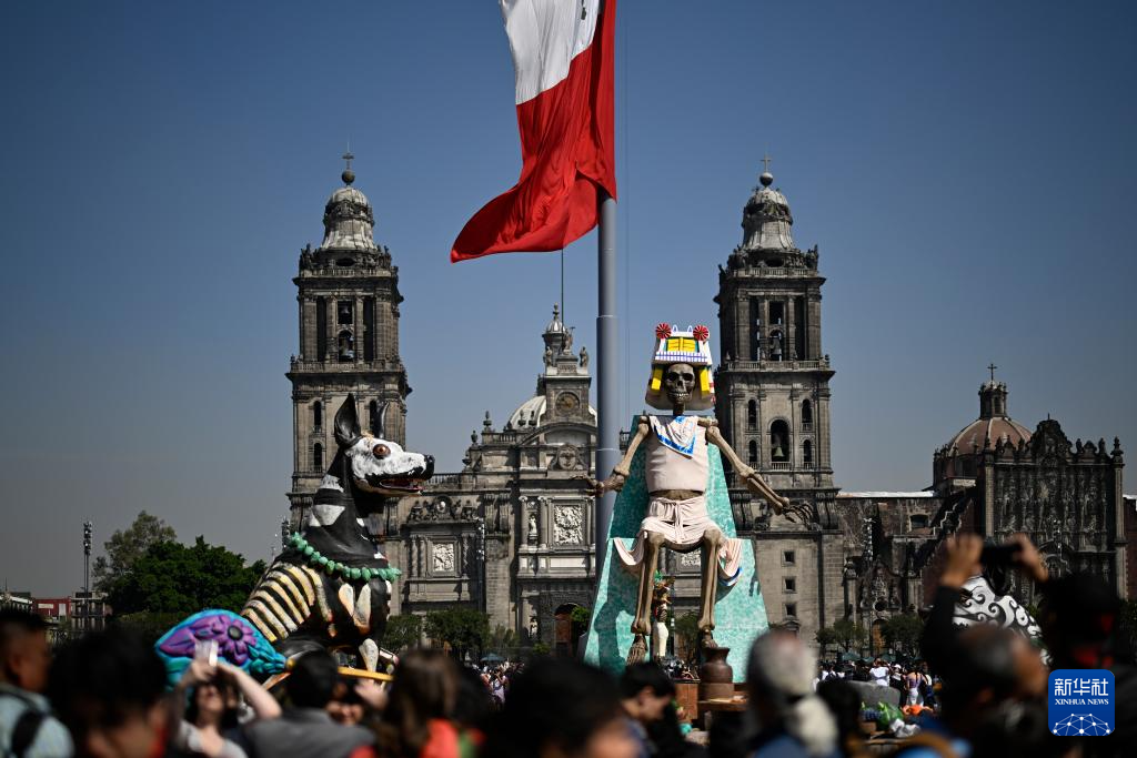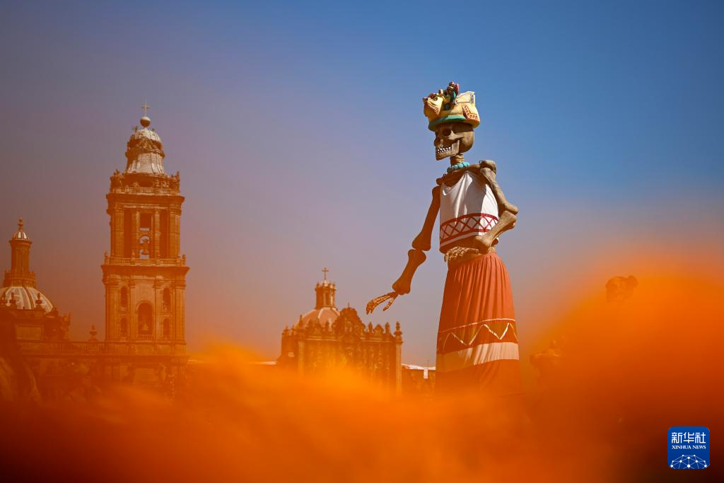 这是10月31日在墨西哥首都墨西哥城的宪法广场外拍摄的亡灵节装饰,今年宪法广场亡灵节祭坛的主题为纪念特诺奇蒂特兰建城700周年。