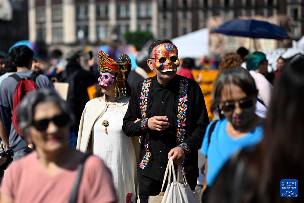 10月31日,民众头戴面具在墨西哥首都墨西哥城的宪法广场观看亡灵节祭坛,今年宪法广场亡灵节祭坛的主题为纪念特诺奇蒂特兰建城700周年。
