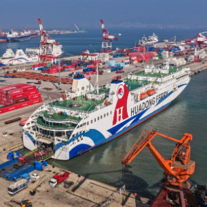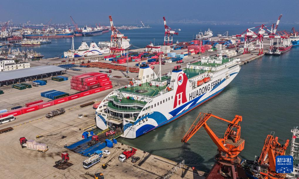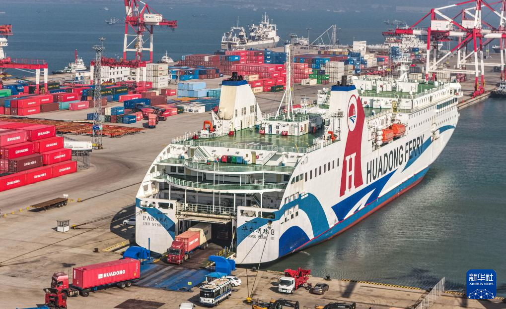 11月1日,山东省荣成市石岛管理区石岛新港口岸,外籍客货滚装船在装卸货物(无人机照片)。