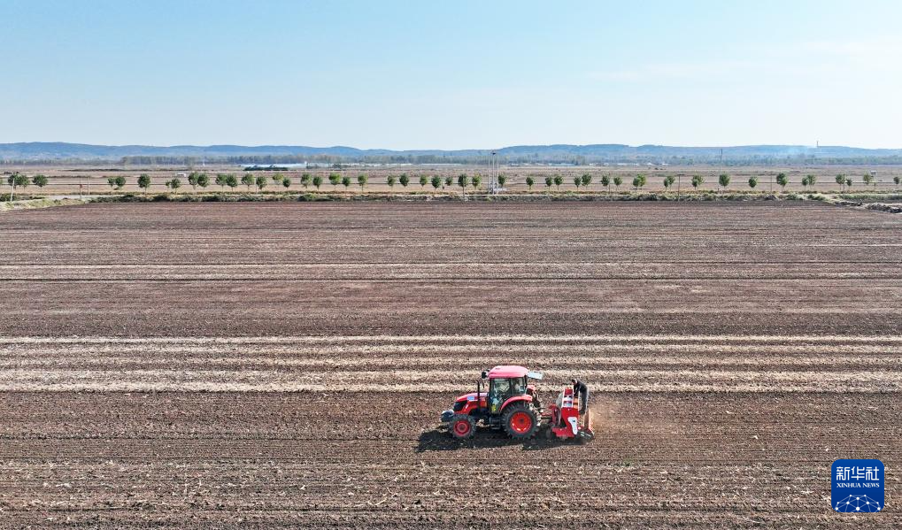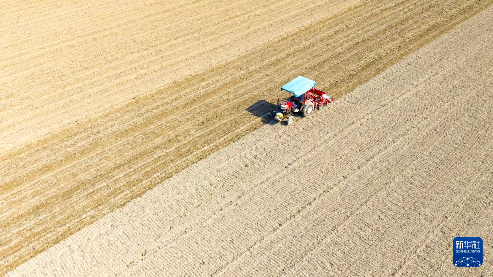 11月3日,在河北省石家庄新乐市化皮镇官庄村,农民驾驶农机播种小麦(无人机照片)。