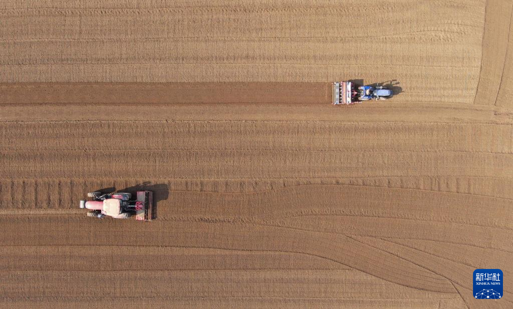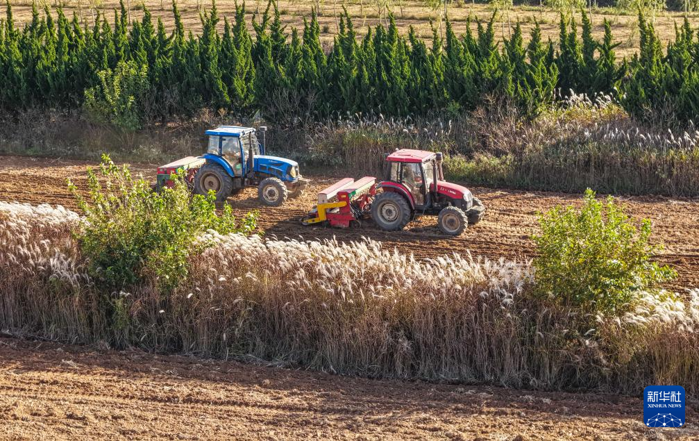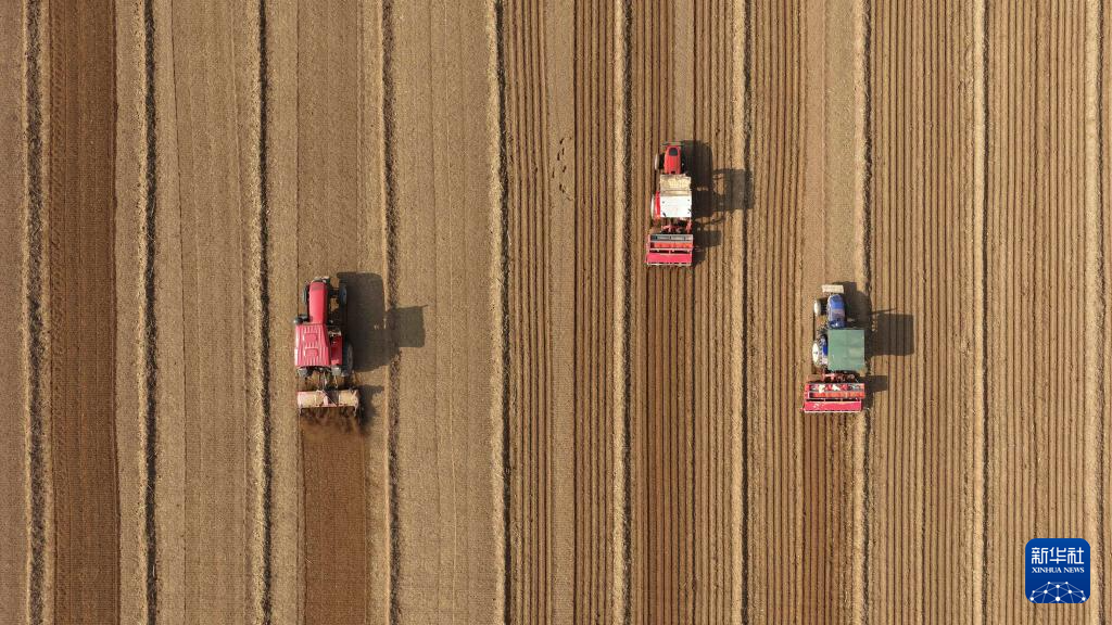 11月3日,在山东省临沂市郯城县郯城街道,农民播种冬小麦(无人机照片)。