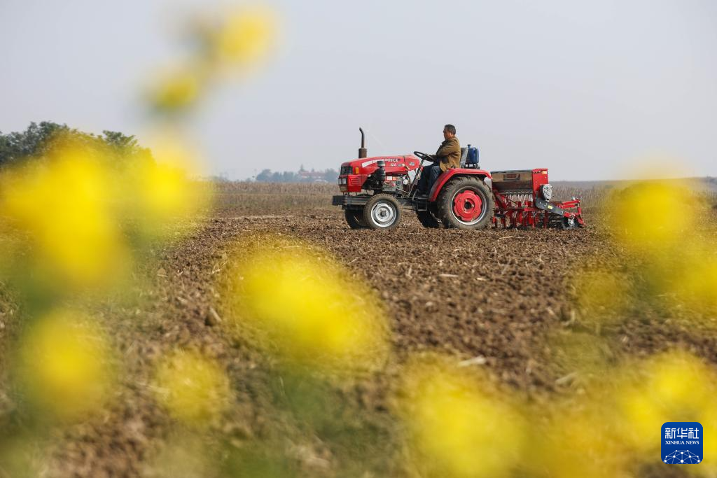 11月1日,在河北省石家庄新乐市长寿街道办事处东名村,农民驾驶农机播种冬小麦。