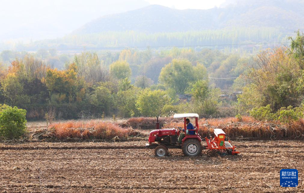 11月3日,在河北省石家庄市井陉县威州镇东街村田地,农户驾驶农机播种冬小麦。