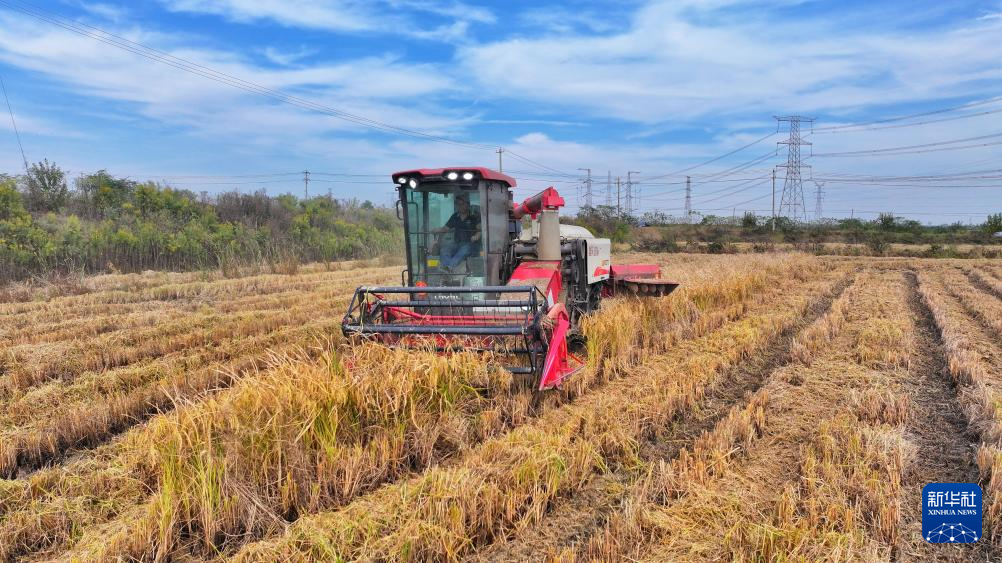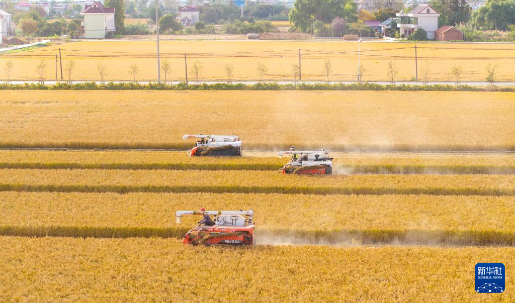 11月3日,在安徽省合肥市蜀山区小庙镇段冲村,农机手驾驶收割机在田间收割水稻(无人机照片)。