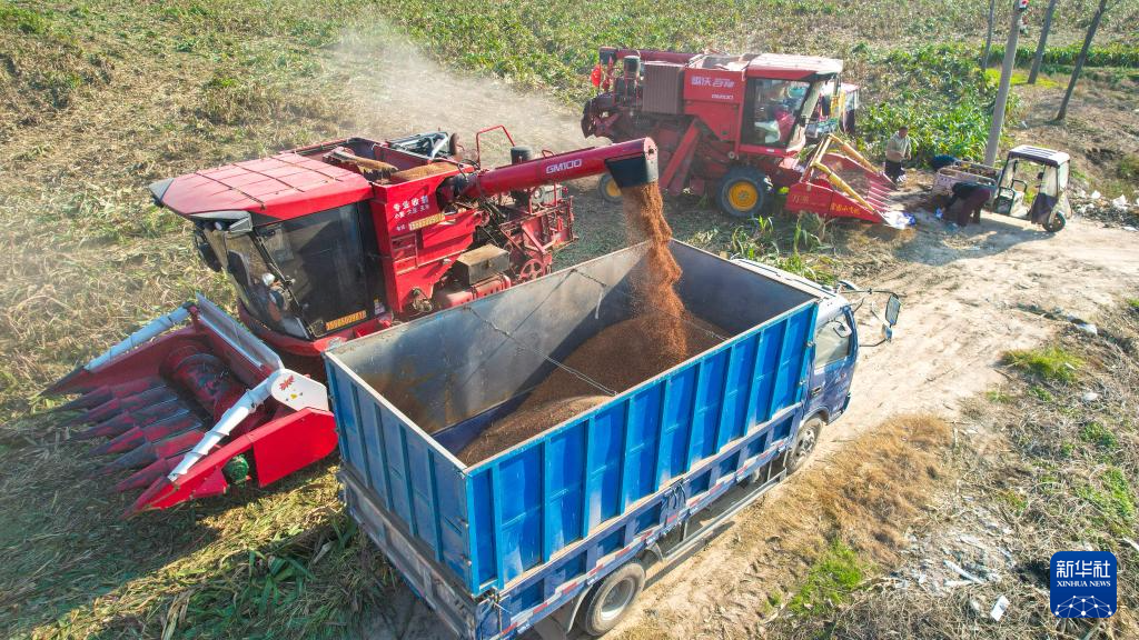 11月2日,在河南省三门峡市灵宝西阎乡黄河岸边,收割机把抢收的玉米装车(无人机照片)。