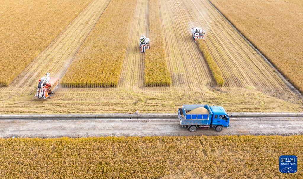 11月3日,河南省商丘市夏邑县会亭镇花园村农民驾驶农机在田间收获高粱(无人机照片)。