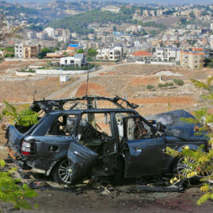 11月2日,在黎巴嫩南部一村庄,一名男子经过遭袭汽车残骸。