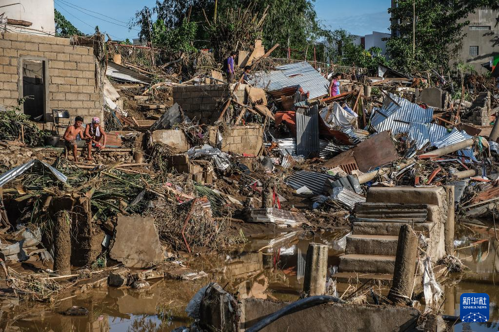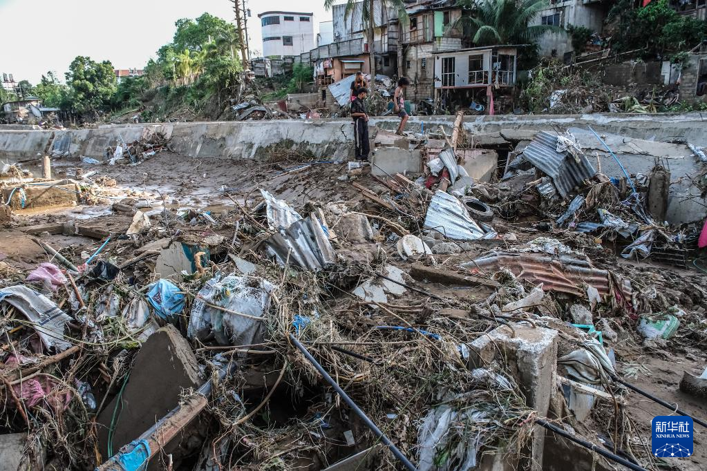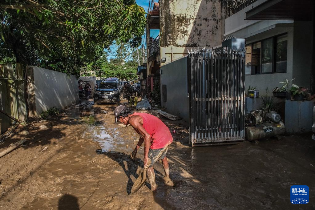 11月5日,在菲律宾宿务省,一名男子清理洪水带来的淤泥。