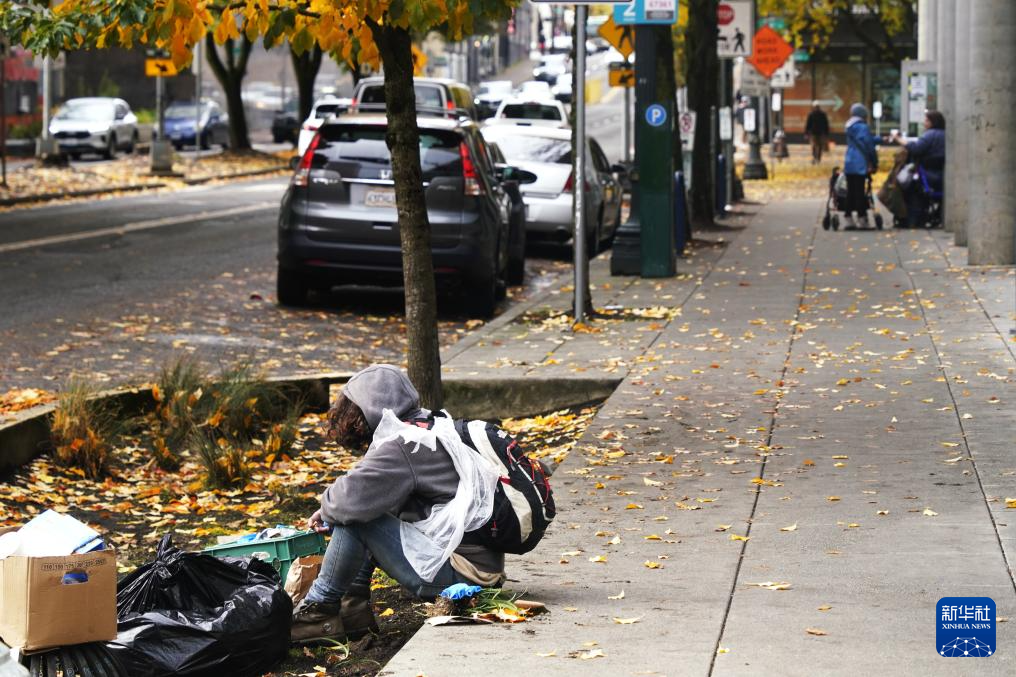 11月4日,在美国俄勒冈州波特兰,无家可归者坐在路边垃圾旁。