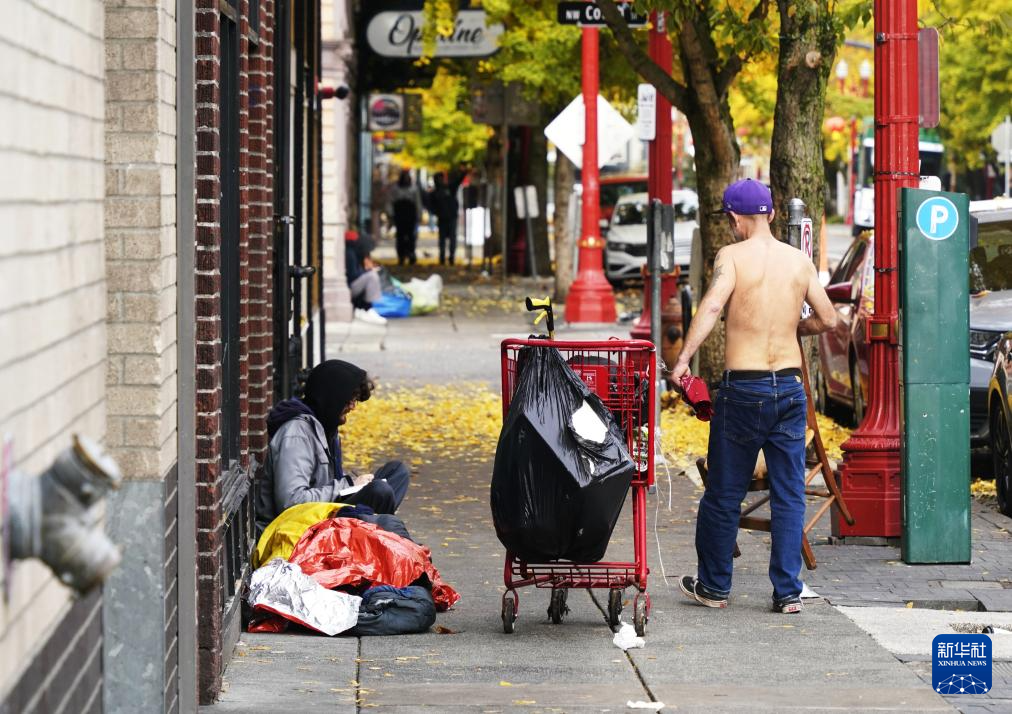 11月4日,在美国俄勒冈州波特兰,无家可归者在街头拾荒。