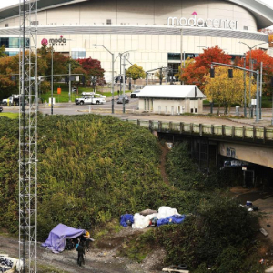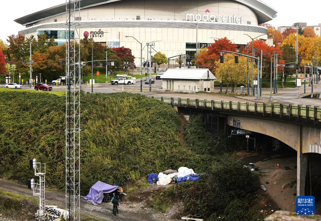 11月4日,在美国俄勒冈州波特兰,无家可归者在开拓者队主场附近的桥下搭建帐篷栖身。