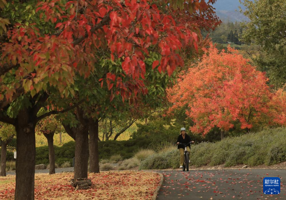 11月4日,在美国加州纳帕谷,一名女子在林荫道上骑自行车。