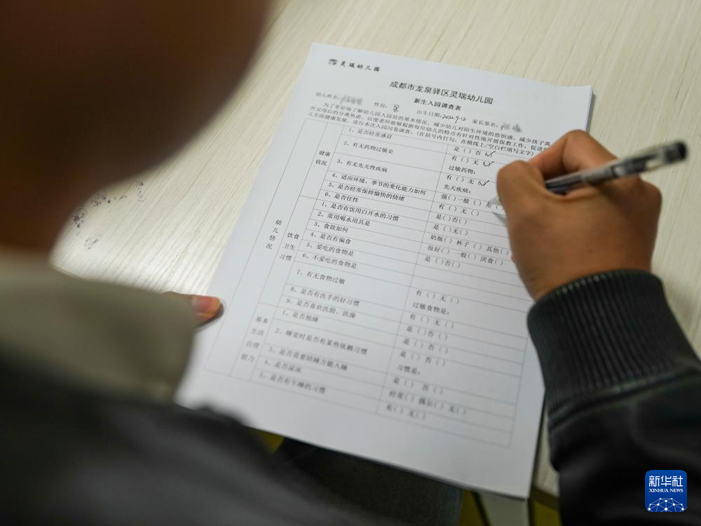 11月4日,家长在四川省成都市龙泉驿区灵瑞幼儿园填写新生入园调查表。