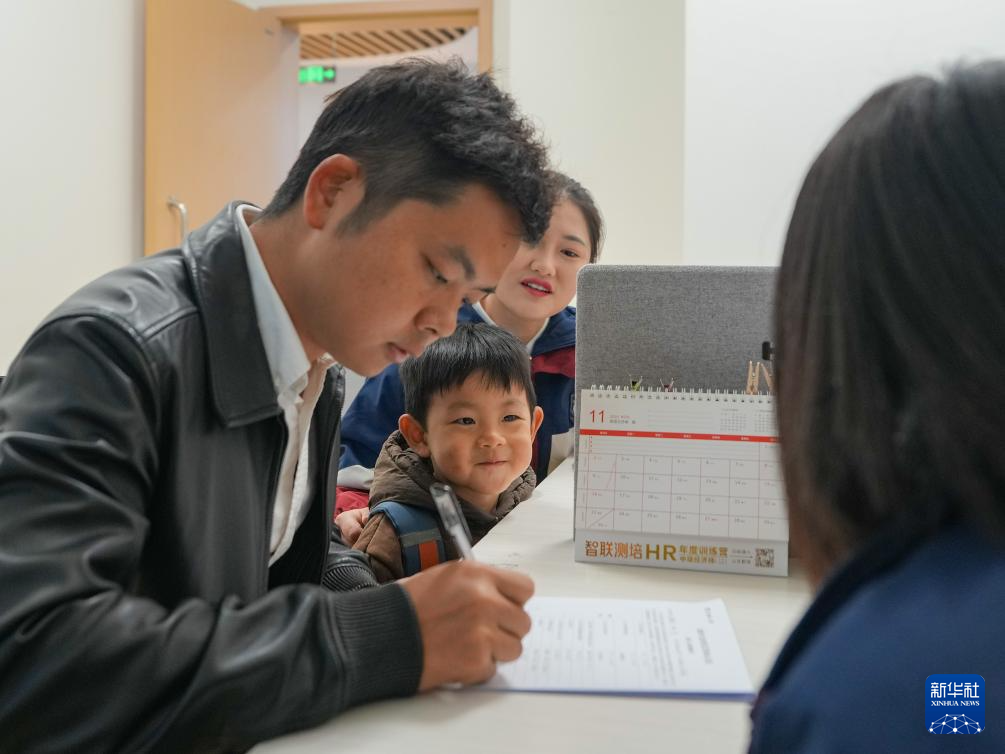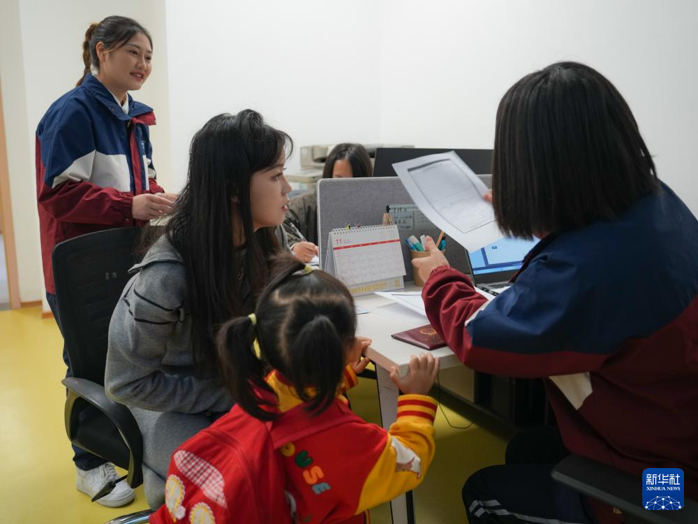 11月4日,家长带着小朋友在四川省成都市龙泉驿区灵瑞幼儿园填写新生入园调查表。