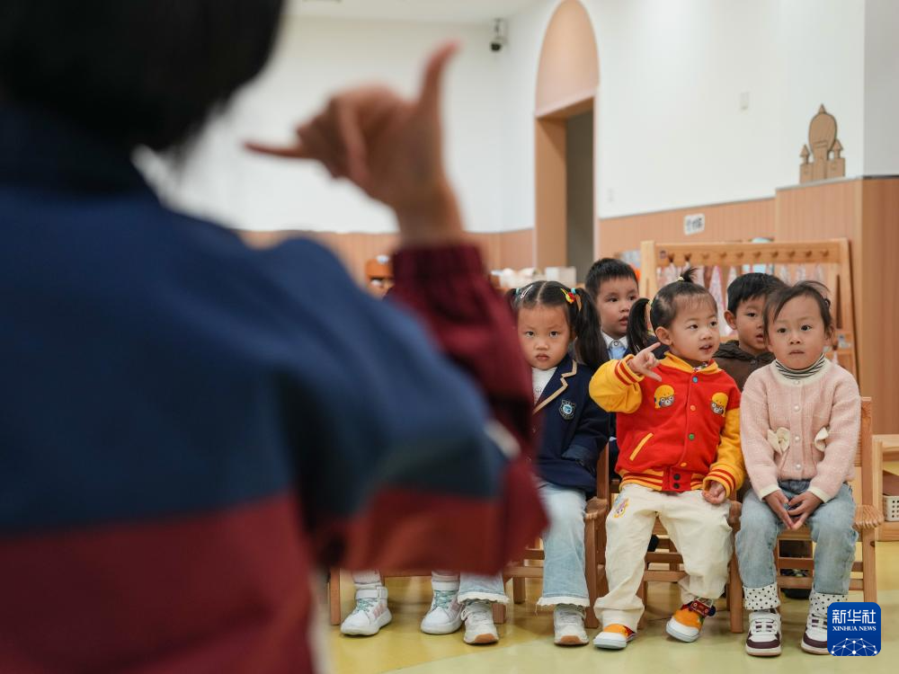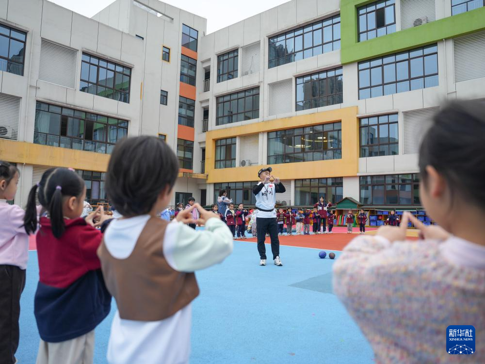 11月4日,小朋友在老师的带领下在四川省成都市龙泉驿区灵瑞幼儿园玩游戏。