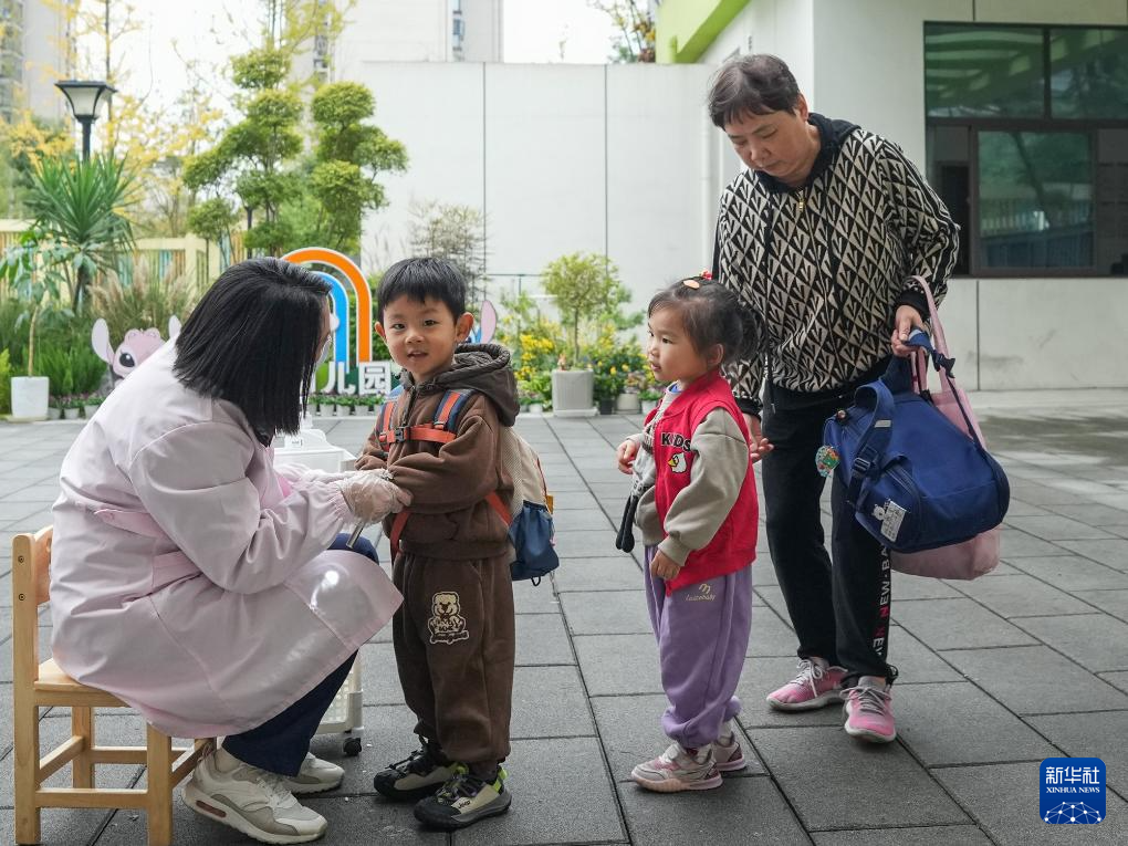 11月4日,家长带着小朋友在四川省成都市龙泉驿区灵瑞幼儿园进行入园检查。