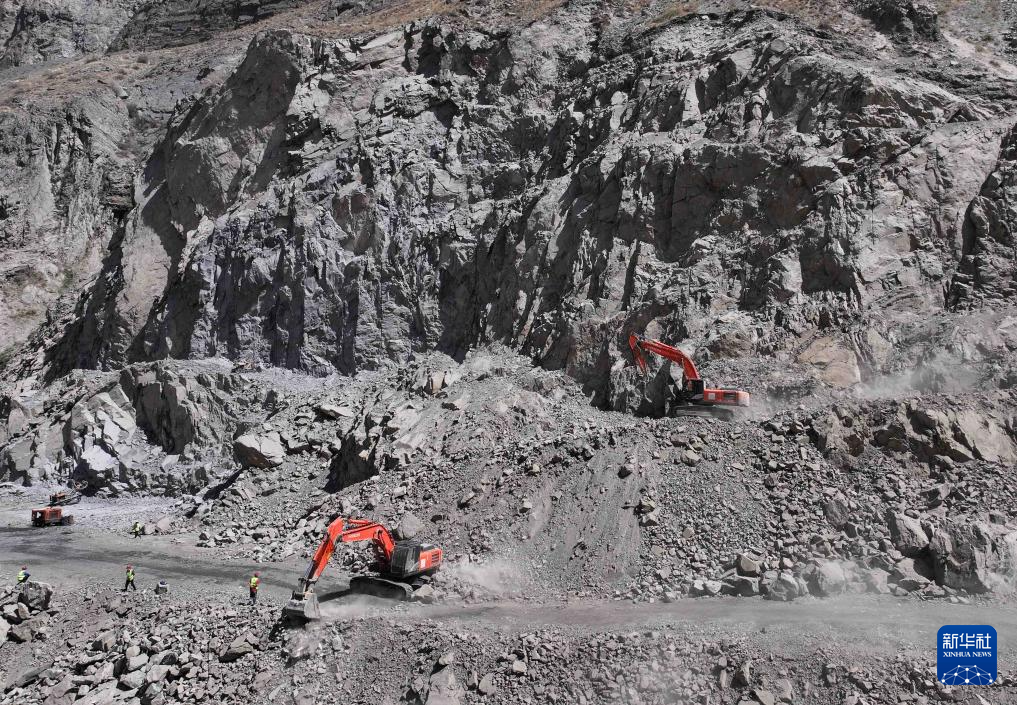 这是9月11日在塔吉克斯坦卡拉依洪姆村附近拍摄的中塔公路二期工程施工现场(无人机照片)。