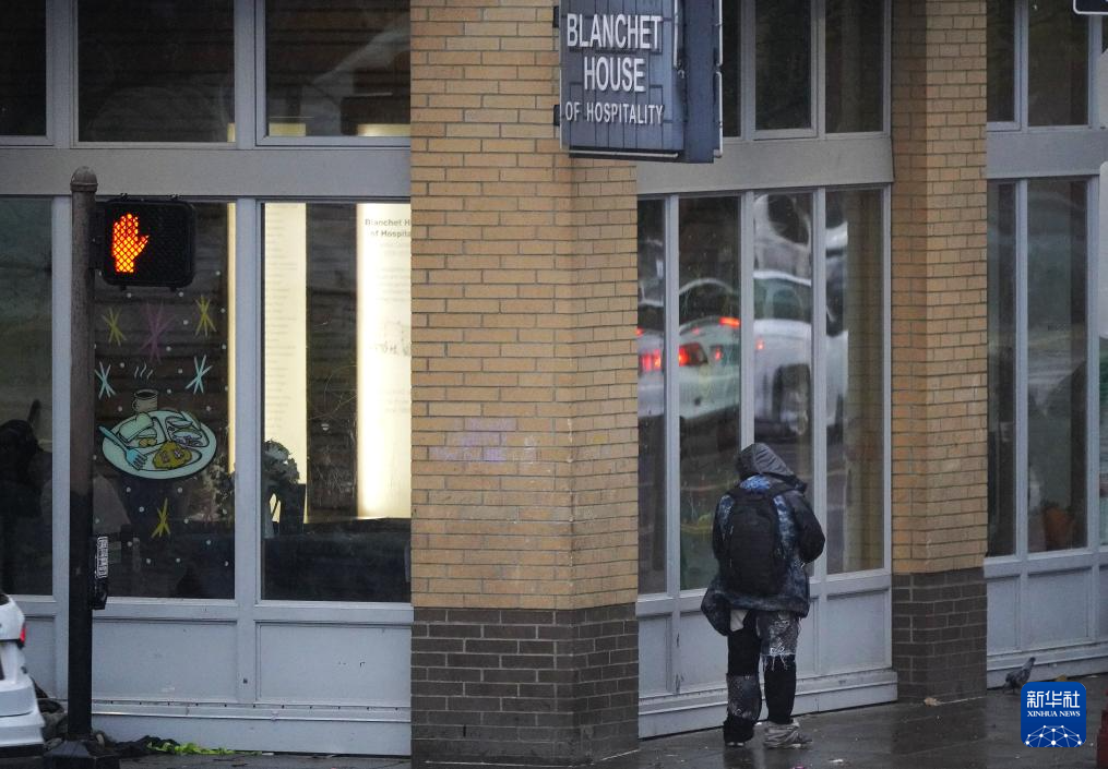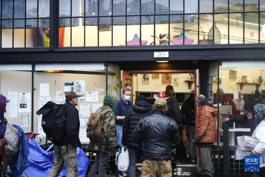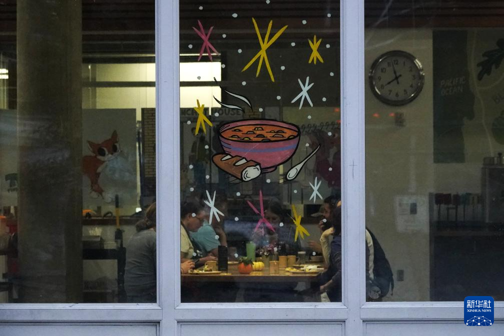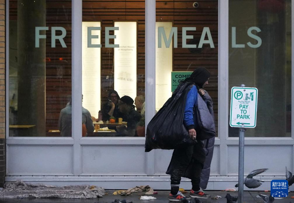 11月5日清晨,在美国俄勒冈州波特兰的深秋寒意中,无家可归者从免费提供食物的机构窗外走过。
