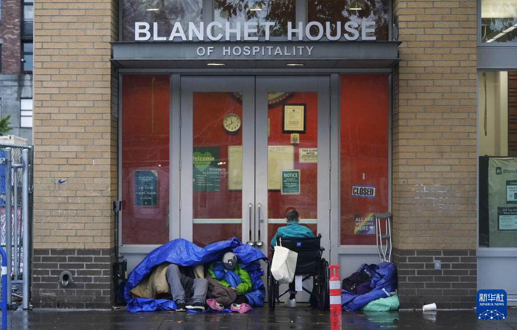 11月5日清晨,在美国俄勒冈州波特兰的深秋寒意中,无家可归者躺在免费提供食物的机构窗外。