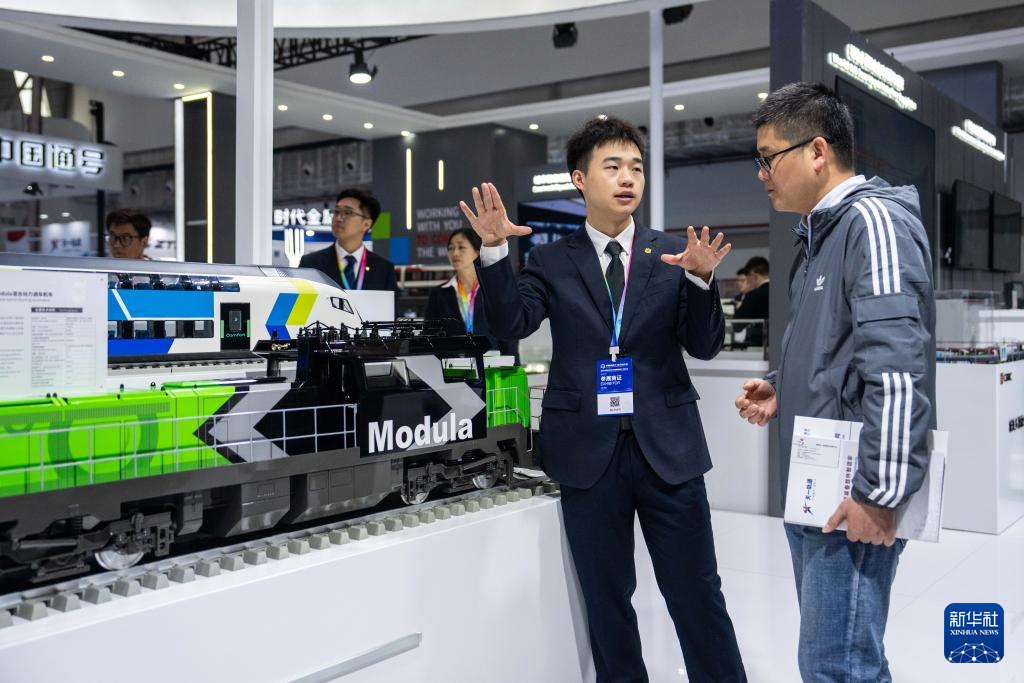 11月7日,工作人员(左)在株洲国际会展中心为观众介绍一款混合动力机车。