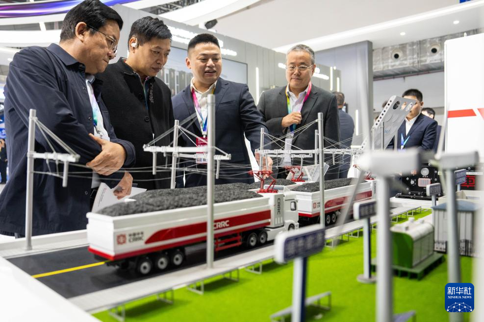 11月7日,工作人员(左三)在株洲国际会展中心为观众介绍电气化公路运输系统。