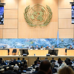 这是11月7日在瑞士日内瓦万国宫拍摄的联合国人权理事会普遍定期审议工作组第五十届会议现场。