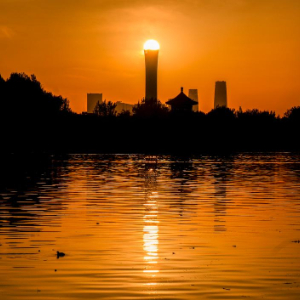 11月10日清晨,北京上空晨曦微露,霞光满天。中国尊、望海楼等地标建筑在晨光中与什刹海光影交错。