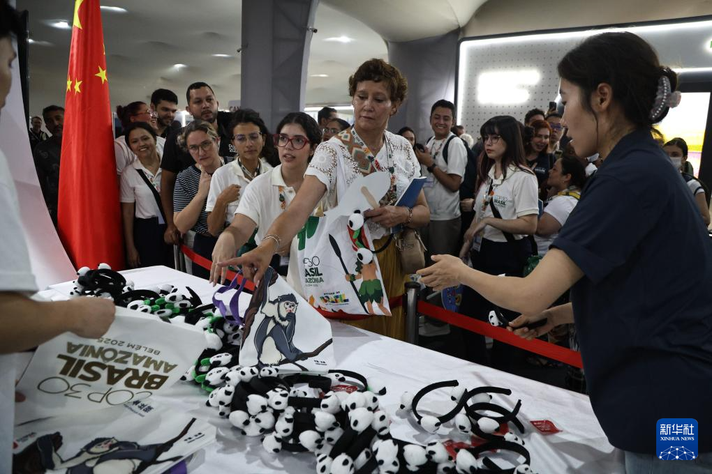 11月10日,在巴西贝伦,与会代表在COP30“中国角”领取纪念品。