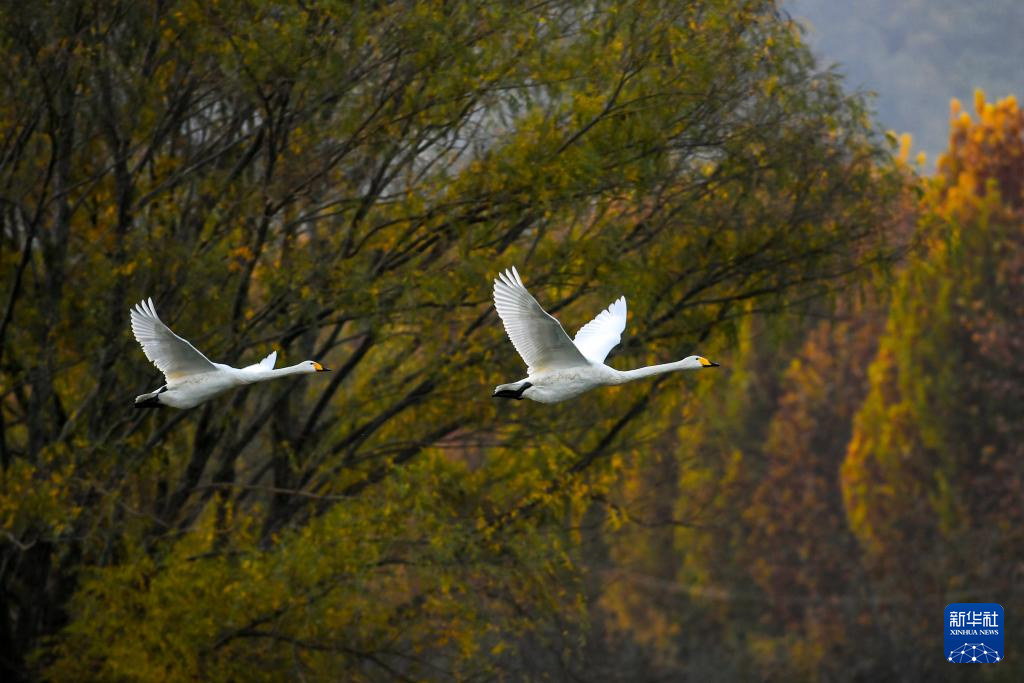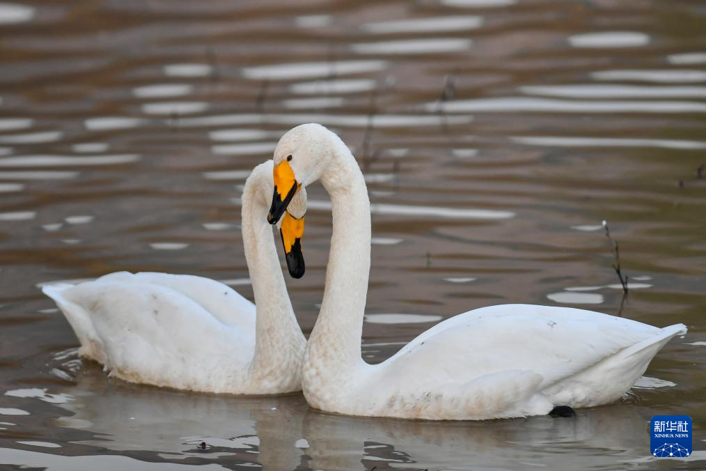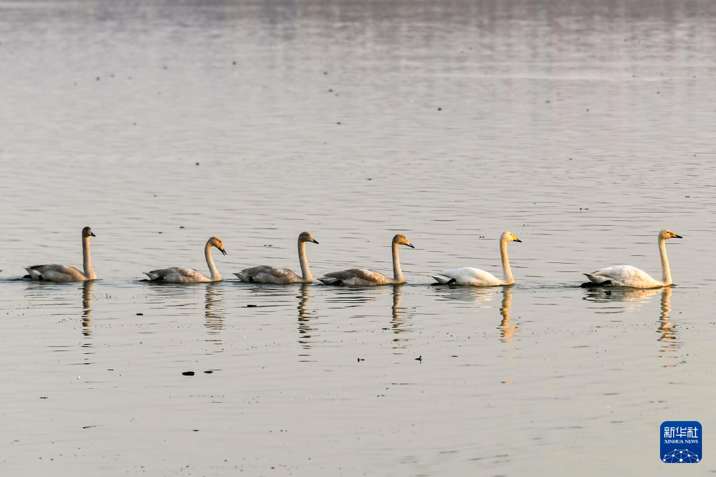 11月11日,白天鹅在山西平陆黄河湿地水面上游弋。