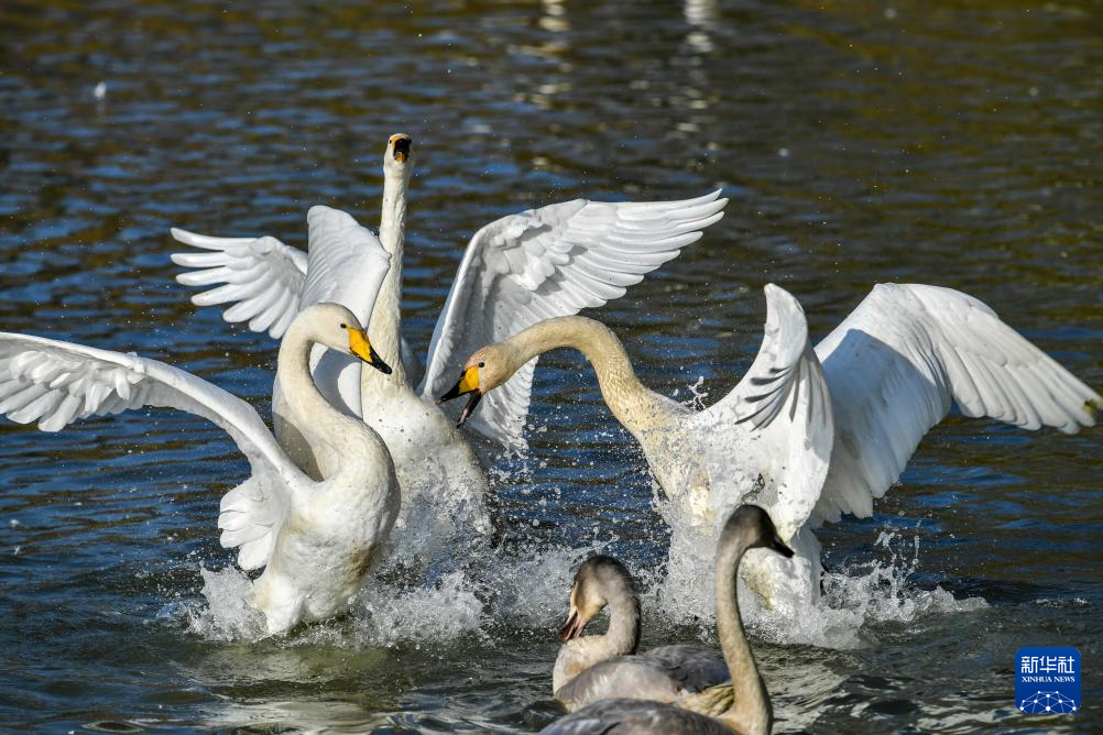 11月12日,白天鹅在山西平陆黄河湿地嬉戏。