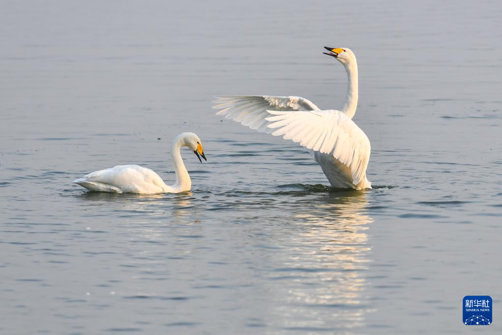 11月13日,白天鹅在山西平陆黄河湿地嬉戏。