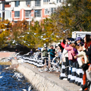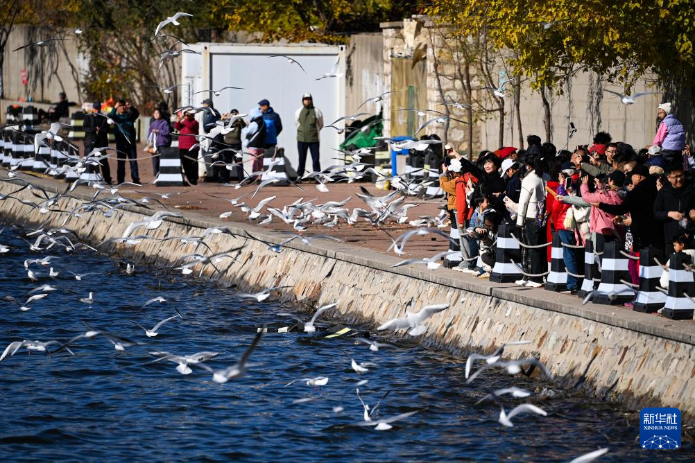 近日,天津市迎来候鸟迁徙高峰,大批海鸥从寒冷的西伯利亚迁徙至滨海新区老码头附近的海河岸边越冬,每天栖息在这里的海鸥达到上千只,吸引了许多游客前来观赏。