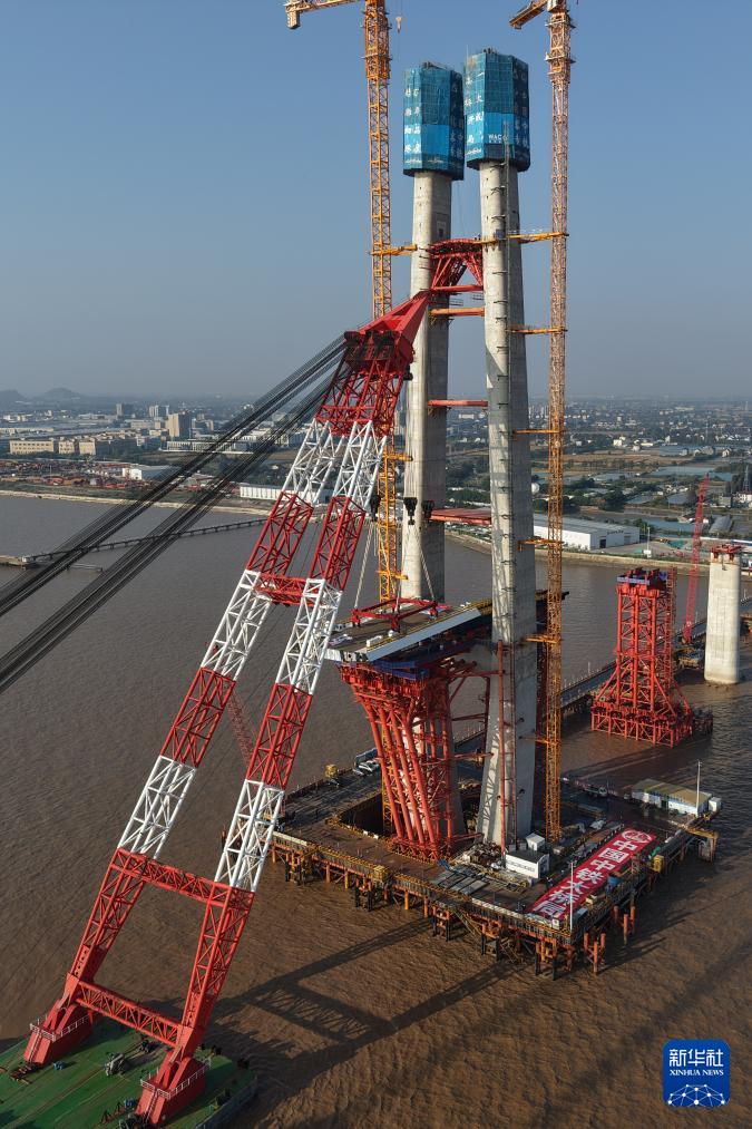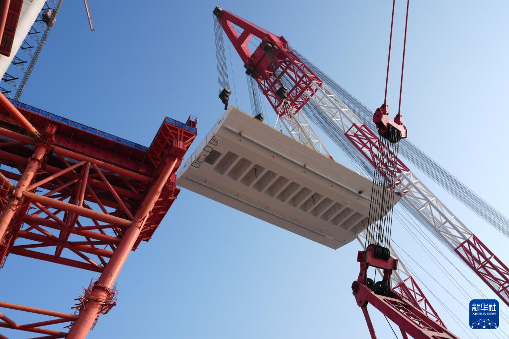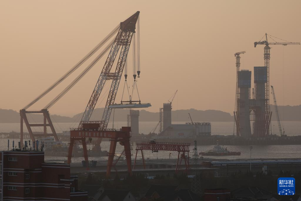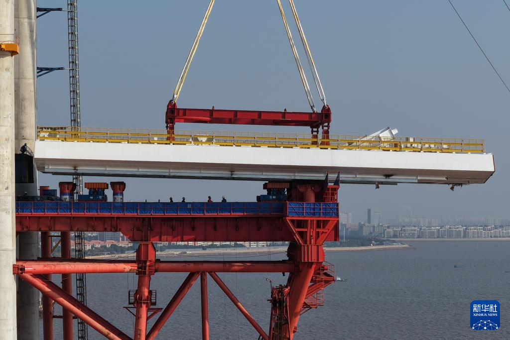 11月15日拍摄的杭州湾跨海铁路桥北航道桥钢梁架设现场。