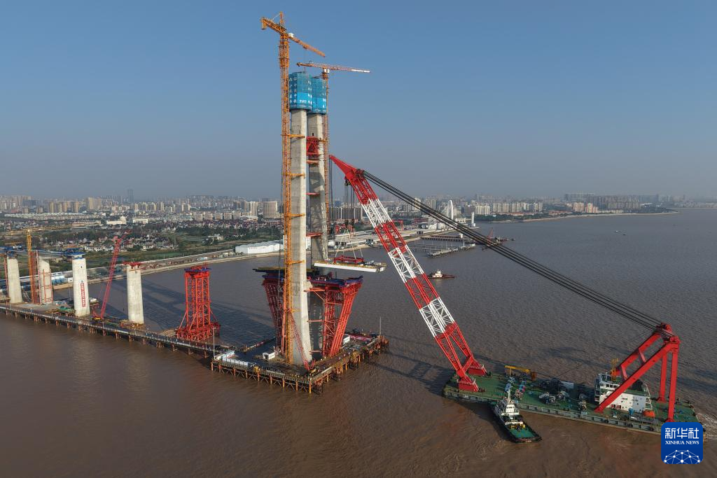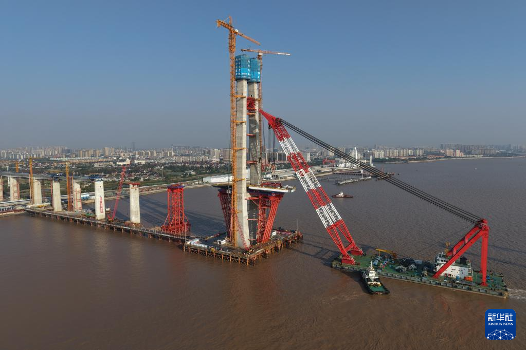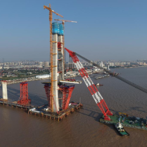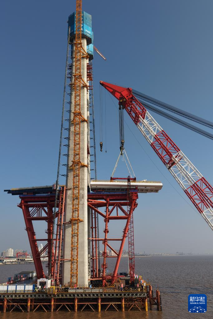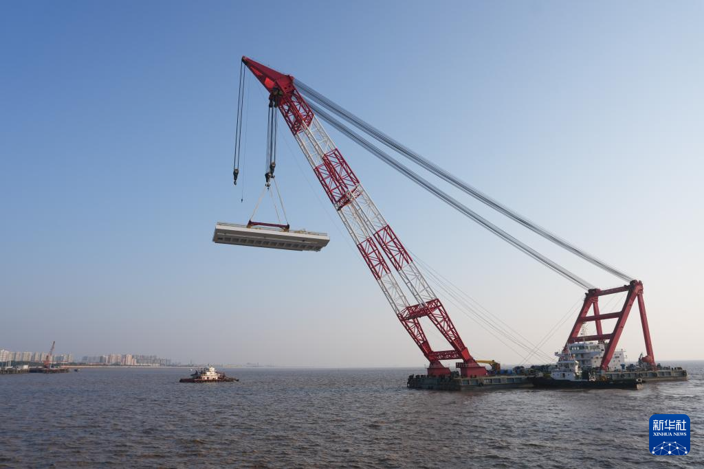 11月15日,在浙江杭州湾海盐侧离岸约0.4公里的海面上,重达626吨的钢梁在浮吊船的吊装下,精准架设到8号主墩上,标志着由沪杭客专公司建设管理、中铁大桥局承建的杭州湾跨海铁路桥北航道桥钢梁开始架设,桥梁正式进入上部结构施工阶段。