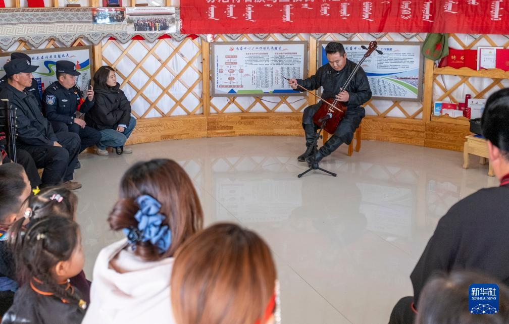 11月12日,在苏尼特右旗额仁淖尔苏木吉呼郎图嘎查赛音巴特尔护边驿站,乌云吉日嘎拉在“送欢乐、送文明”基层服务活动中演奏马头琴。