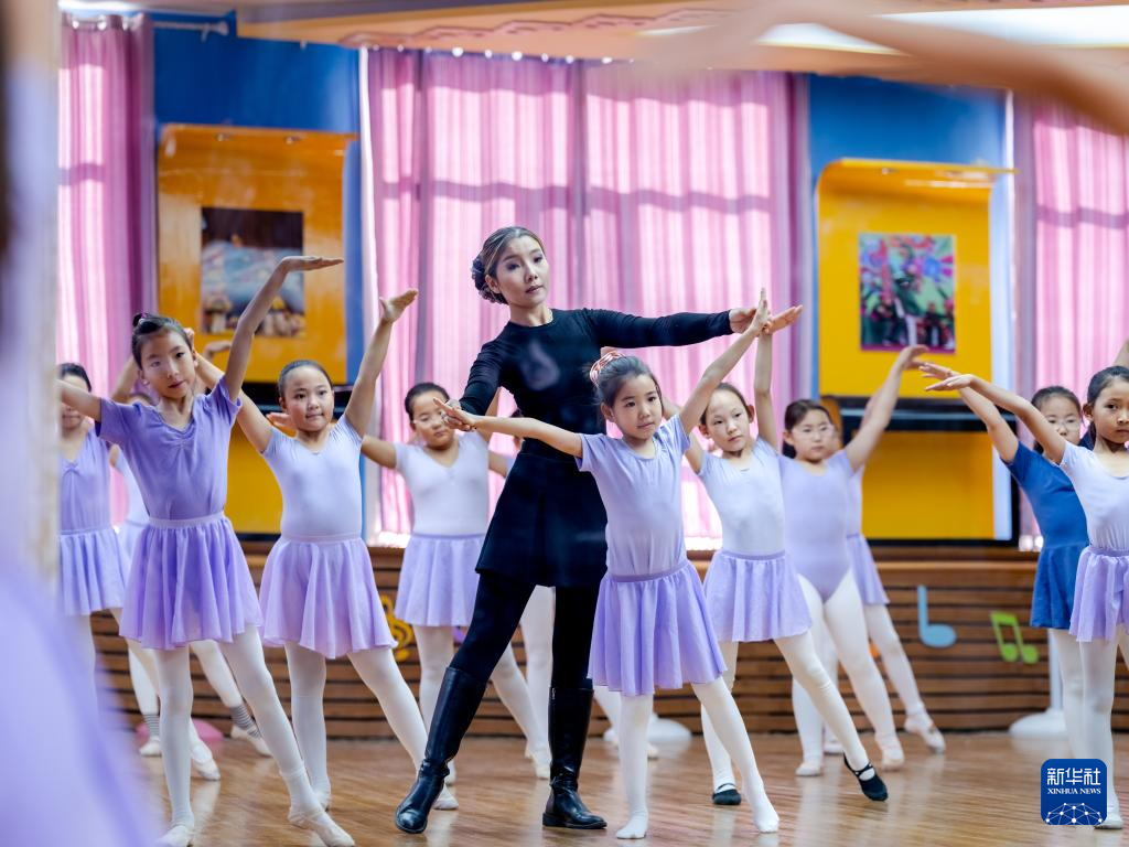 11月13日,在内蒙古锡林郭勒盟苏尼特右旗第五小学,额斯妮勒在指导孩子们练习舞蹈动作。