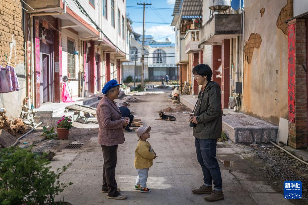 11月12日,张航(右)在昆明市海晏村采风时与村民交流。