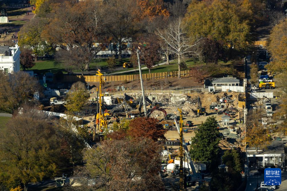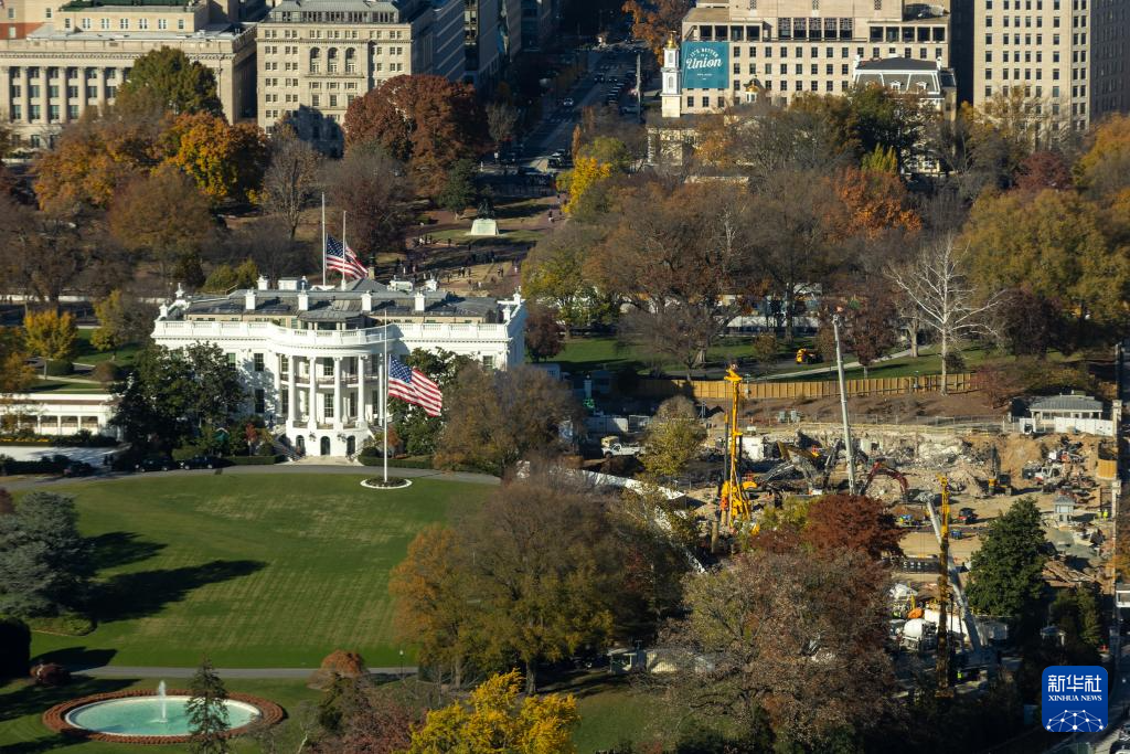这是11月17日从美国首都华盛顿的华盛顿纪念碑上拍摄的白宫行政官邸和正在施工的东翼。