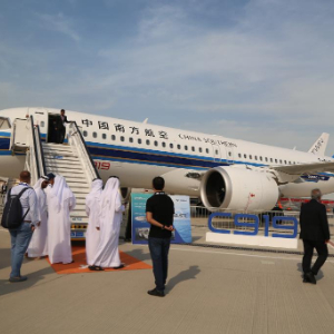 11月17日,在阿联酋迪拜,中国商飞的C919飞机进行飞行展示,地面上停着的是中国南航的C919飞机。