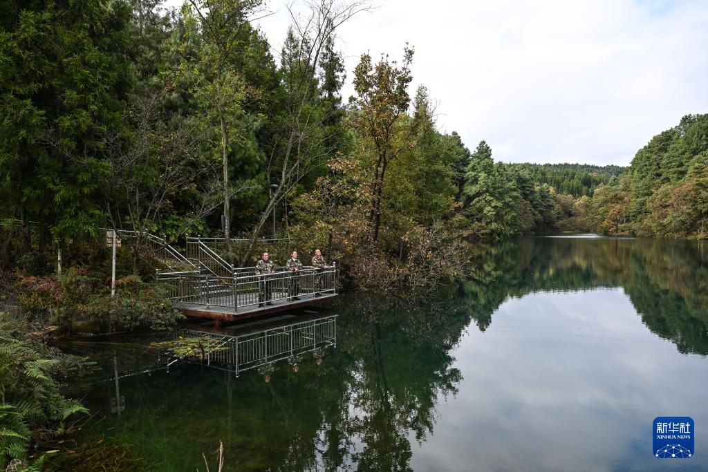 张建(右)、张忠(左)、张华在贵州省毕节市七星关区拱拢坪国有林场观察林区动态(11月13日摄)。